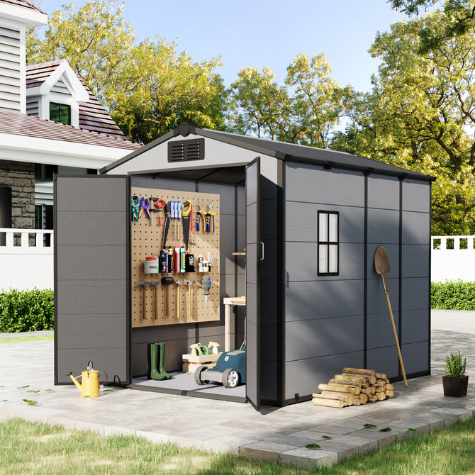 6x8 FT Outdoor Storage Shed, Weather-Resistant Shed with Lockable Double Doors & Built-In Floor, Sloped Roof Outdoor Shed for Backyard, Patio & Lawn, Gray